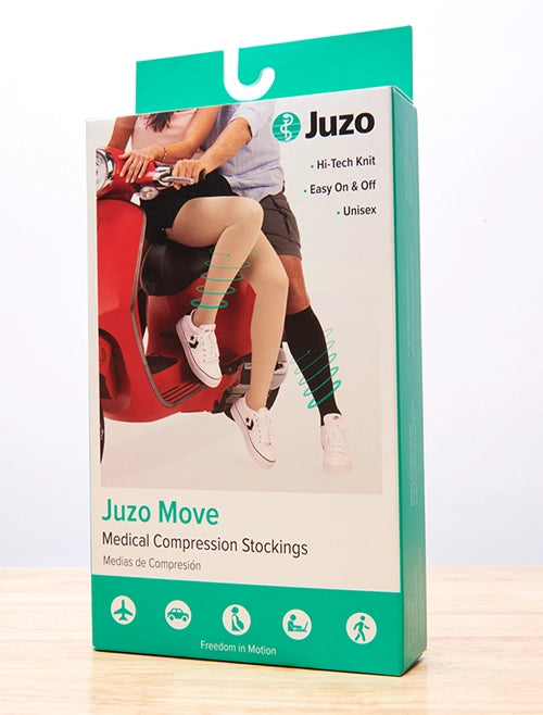 Juzo Move compression stockings are easy to put on, thanks to their patented Glide Knit technology, functional instep zone, and enlarged heel. They glide smoothly over the heel and ankle, while microfibers help keep skin cool and dry. With Juzo Move, you get comfortable, effective medical compression all day long.
